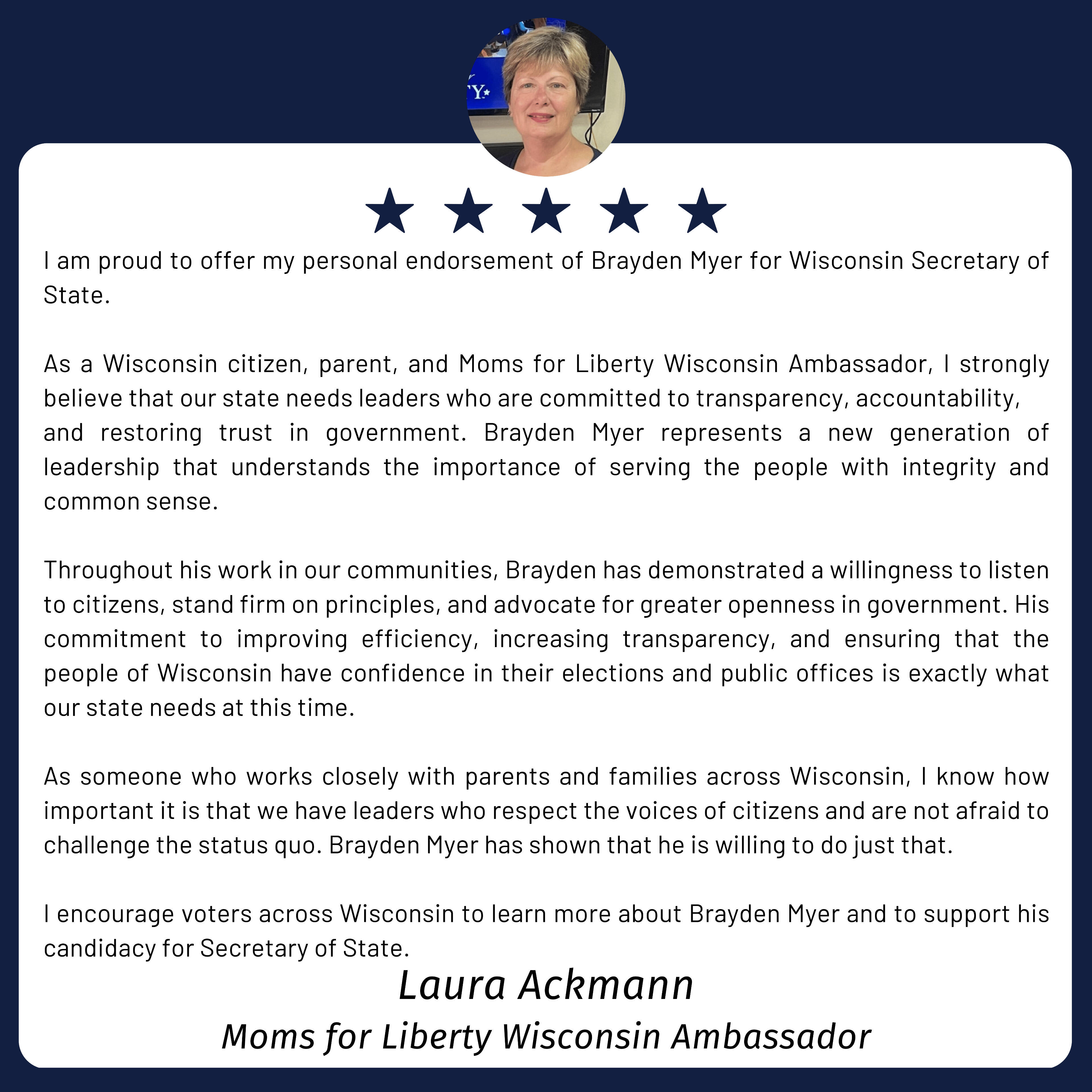 After half a century of failed Democratic leadership, the Secretary of State's office is a shadow of its former self. It is time to send a fighter to Madison. Brayden recognizes the need for reform and is ready to act upon his vision on day one.Brayden will work to form an easily accessible digital database of all the records this office holds and overlooks. This will streamline business and hold the office more accountable as well as increase transparency. Through this, taxpayers will save time and money.Brayden believes timeliness is essential for a government to properly serve its citizens. He will bring accountability by using best practices to prioritize efficiency.The Secretary of State chairs the Board of Commissioners of Public Lands, which oversees 75,000+ acres of public lands and $1.6 billion of school trust funds and provides loans to local governments. In the past, this board has provided loans for politically divisive projects. Brayden will push for these loans to address critical infrastructure needs such as fixing our roads.Half a century ago, the legislature removed the Secretary of State's oversight on elections and handed control to unelected boards. Brayden will fight to abolish the Wisconsin Elections Commission, clean the voter rolls and remove their cost, and put this office in charge of elections so voters have someone to directly hold accountable.
